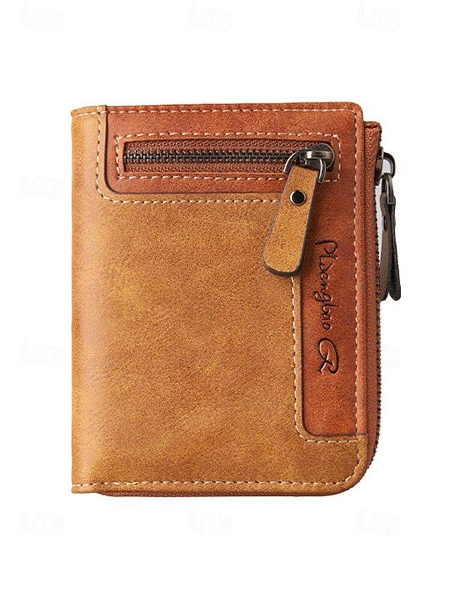 Men's Vintage Brown Leather Wallet with Zipper Pocket and